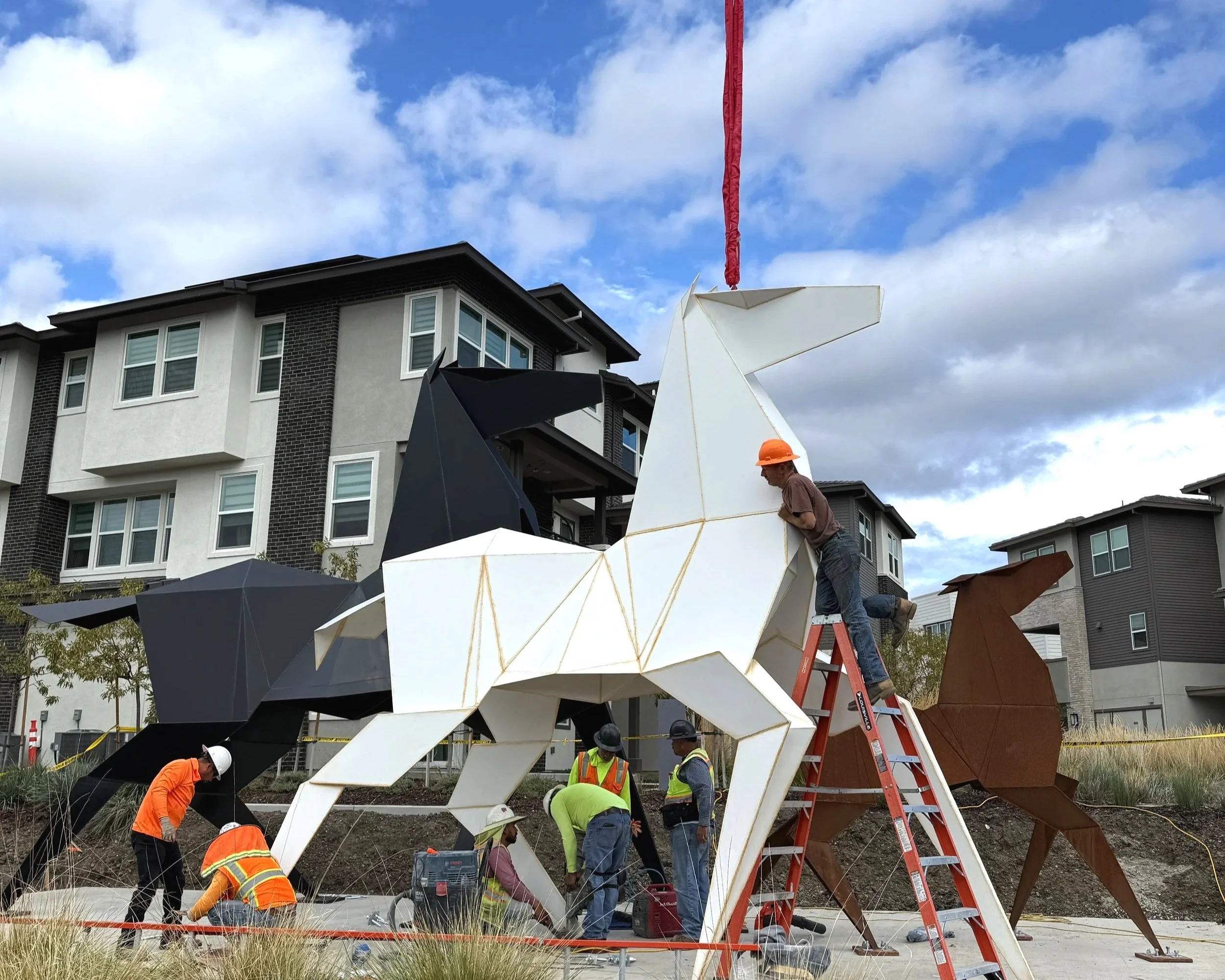 These monumental sculptures take origami to a new scale through the art of fabrication. Beginning with a folded paper model, the form is unfolded, and only the outer contours are traced, enlarged, and transferred onto sheet metal. Once cut and welded back together, the simplified shapes reassemble into a strikingly accurate version of the original fold—now rendered in steel.